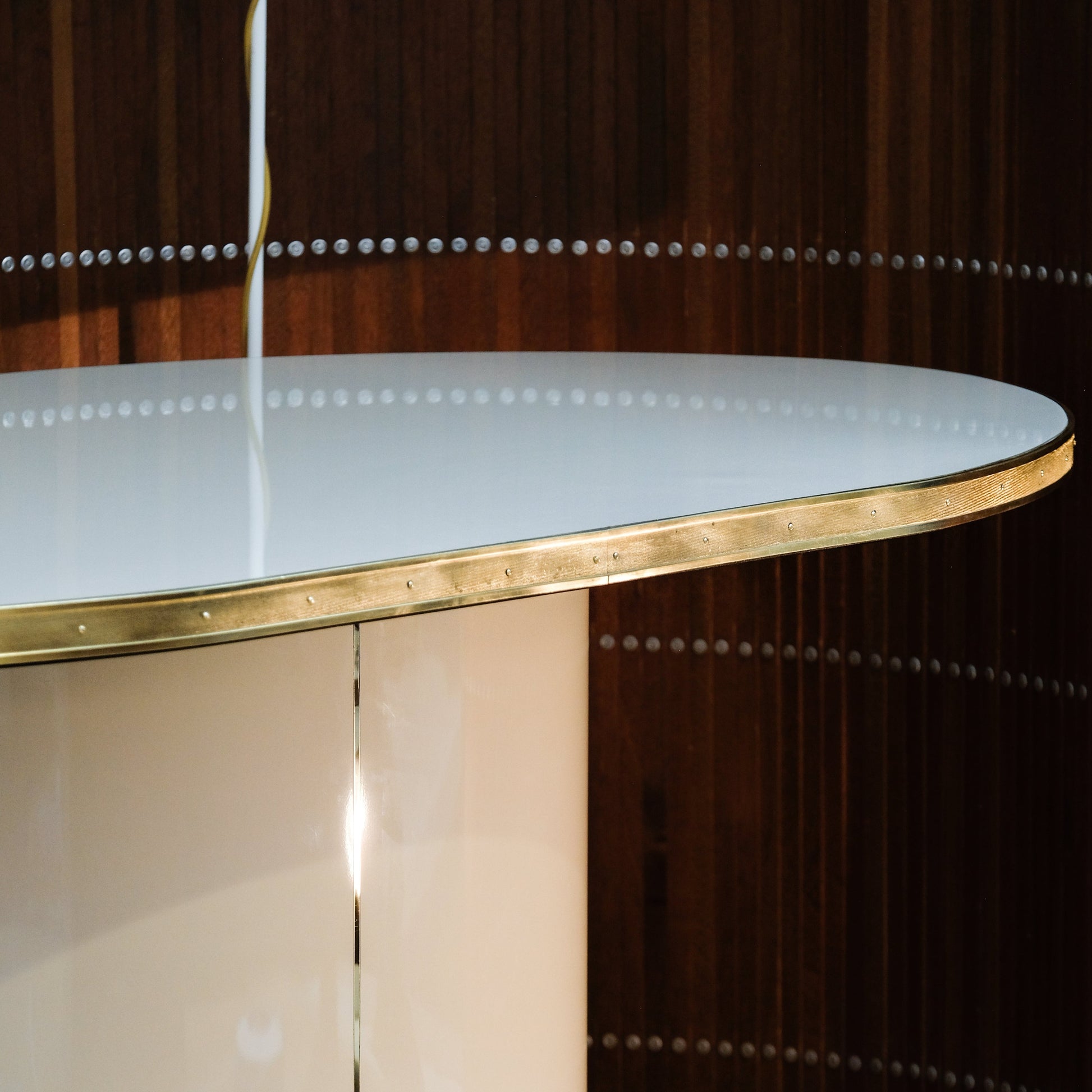 Le plateau est fabriqué à partir d'un stratifié brillant et est garni sur les bords d'une bande de laiton gravée et de vis en laiton, ou en acier inoxydable satiné et de vis assortie. Il est soutenu par un piédestal central, fabriqué en stratifié brillant et orné d'un fin ruban vertical en laiton ou en acier inoxydable.