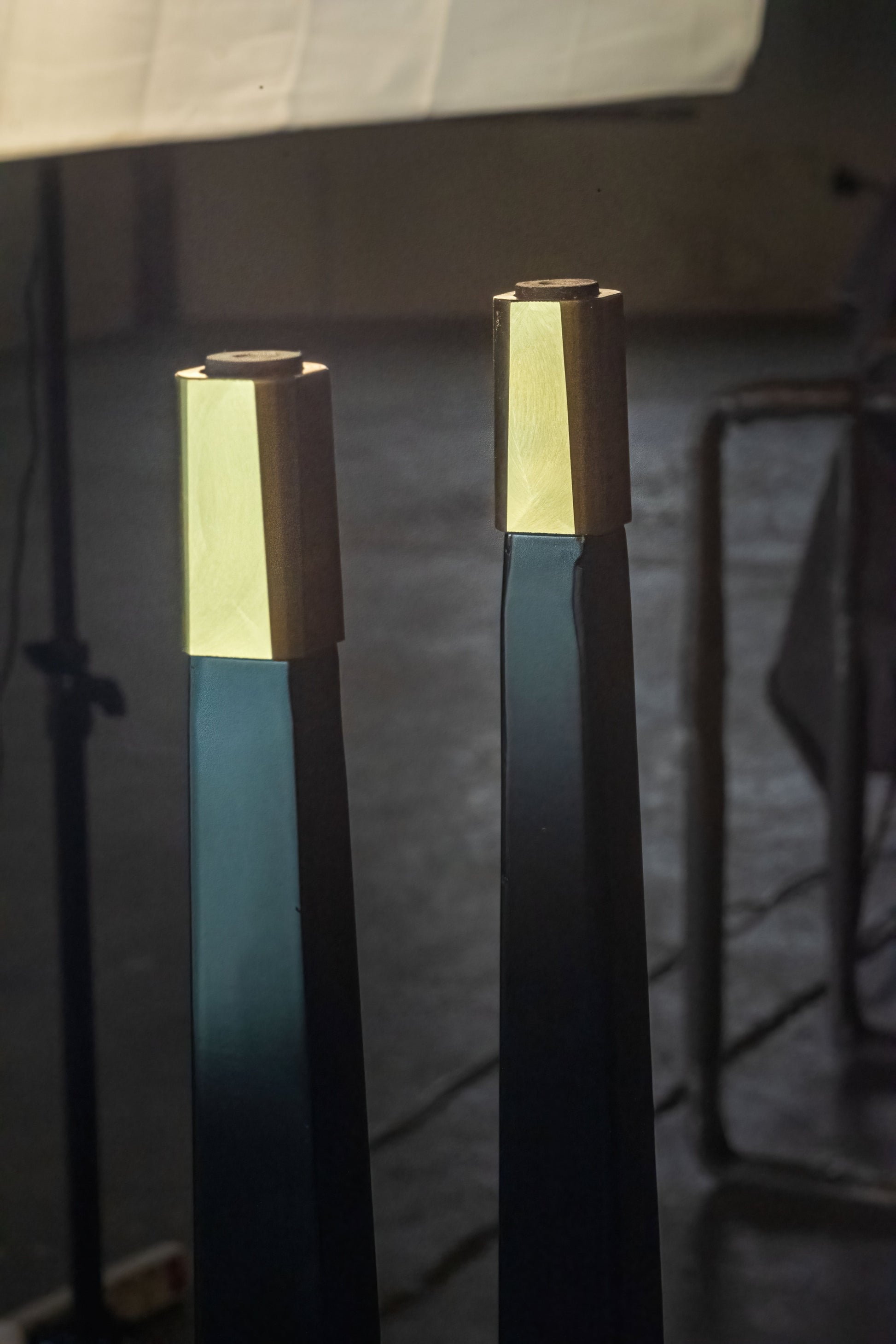 Le tableau est réalisé en stratifié brillant, et est décoré sur les bords d'un ruban de laiton gravé et de vis du même matériau, ou en acier inoxydable satiné et de vis assorties. Les quatre pieds coniques de la table sont en acier peint en noir mat et finis avec des pointes en laiton ou en acier inoxydable.