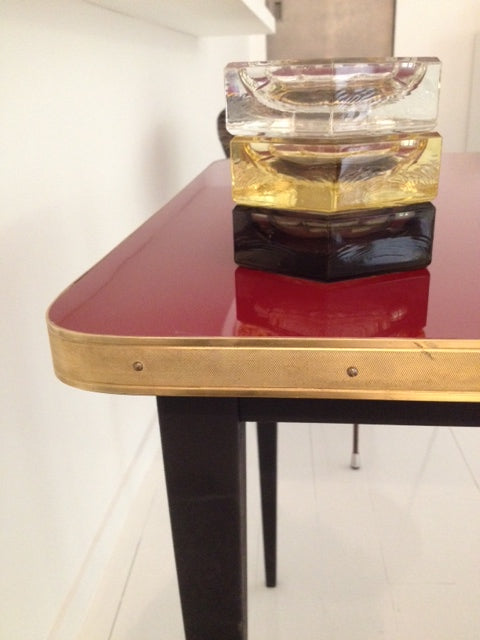 Le plateau de la table est fabriqué en stratifié brillant et est garni sur les bords d'une bande de laiton gravée et de vis en laiton, ou en acier inoxydable satiné et de vis assortie. Les quatre pieds effilés de la table sont en acier peint en noir mat et sont dotés de pointes en laiton ou en acier inoxydable.