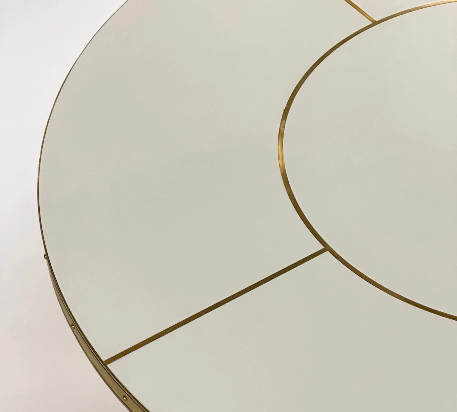 Le plateau de la table est fabriqué en stratifié brillant et ses bords son ornés d'un ruban en laiton gravé et de vis du même matériau, ou en acier inoxydable satiné et de vis assorties. Il est soutenu par un piédestal, fabriqué en stratifié brillant et orné d'un fin ruban vertical en laiton ou en acier inoxydable.