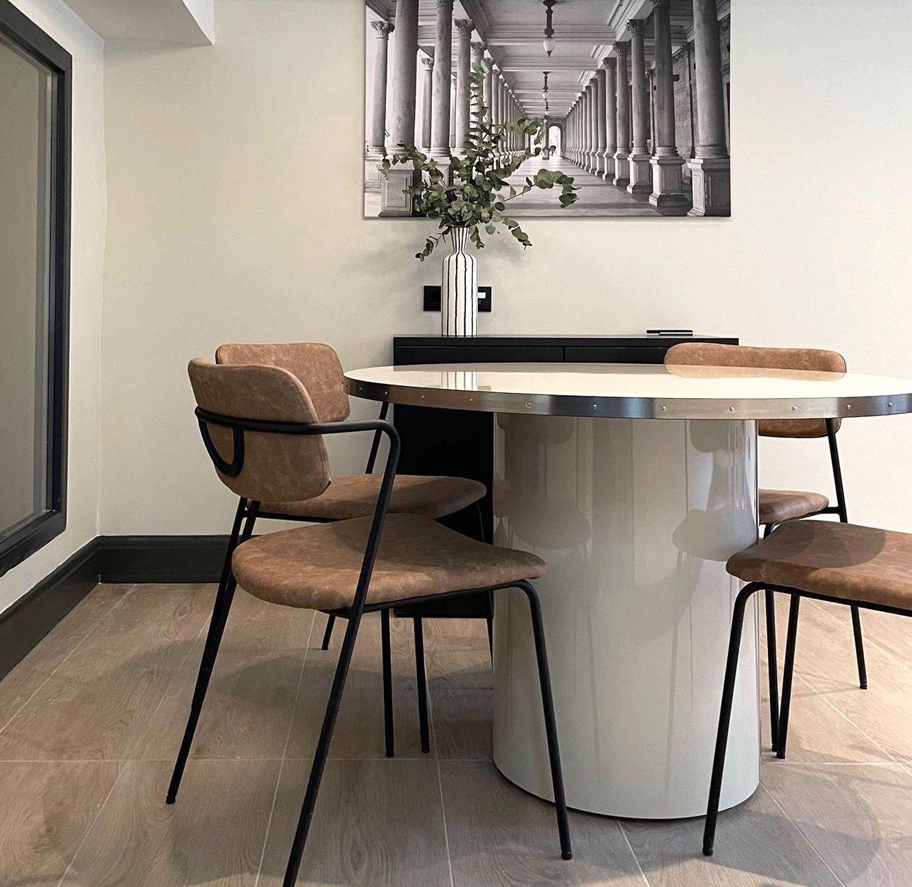 La collection de tables Julieta avec piédestal s'adapte à de nombreux styles de décoration et constitue une bonne option pour les salons, les salles à manger mais aussi les bureaux ou les restaurants. Notre collection exclusive de tables de salle à manger d'inspiration vintage, fabriquées à la main par des artisans dans notre atelier d'Alcoy, peut être entièrement personnalisée en termes de finitions et de dimensions.